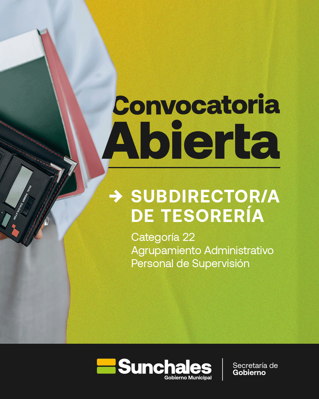 La Municipalidad de Sunchales convoca a profesionales a participar del Concurso Abierto de Antecedentes y Oposición para cubrir el cargo de Subdirector/a de Tesorería – Agrupamiento Administrativo Personal de Supervisión – Categoría 22.